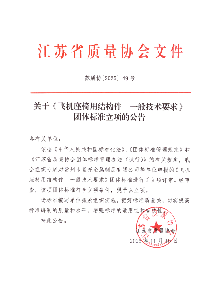 關于《飛機座椅用結構件 一般技術要求》團體標準立項的公告
