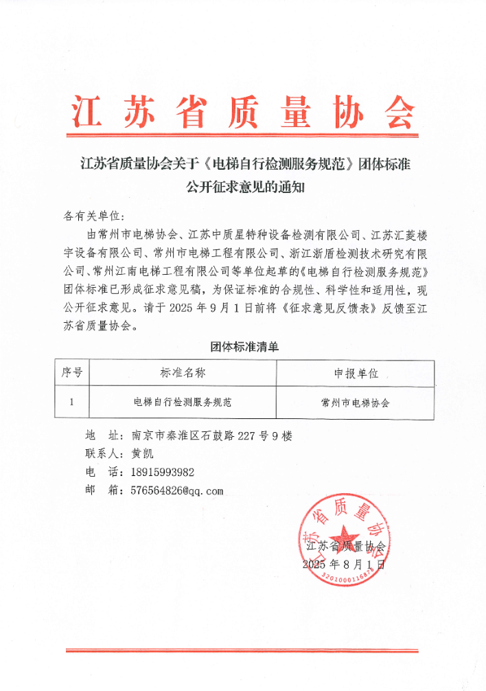江蘇省質量協會關于《電梯自行檢測服務規范》團體標準公開征求意見的通知