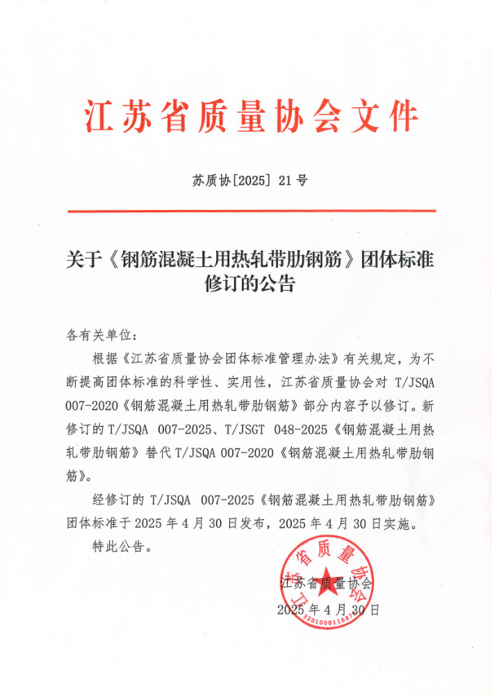 關于《鋼筋混凝土用熱軋帶肋鋼筋》團體標準修訂的公告