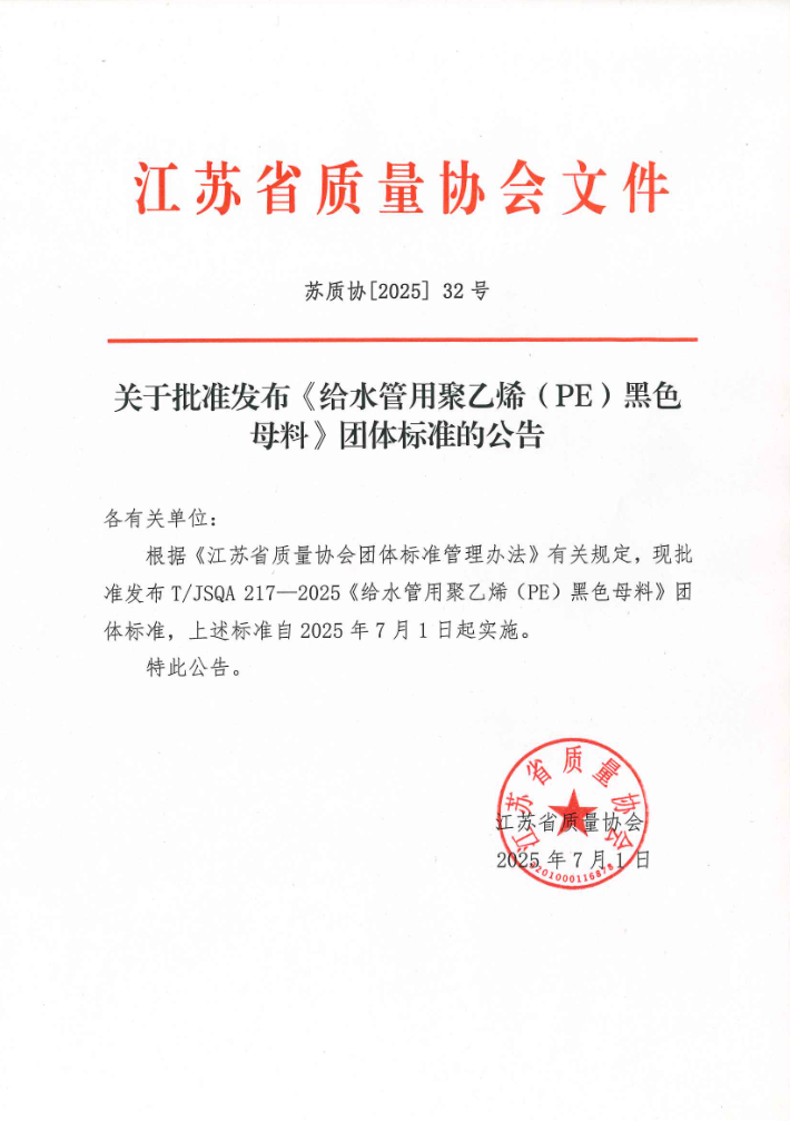 關于批準發布《給水管用聚乙烯(PE)黑色母料》團體標準的公告