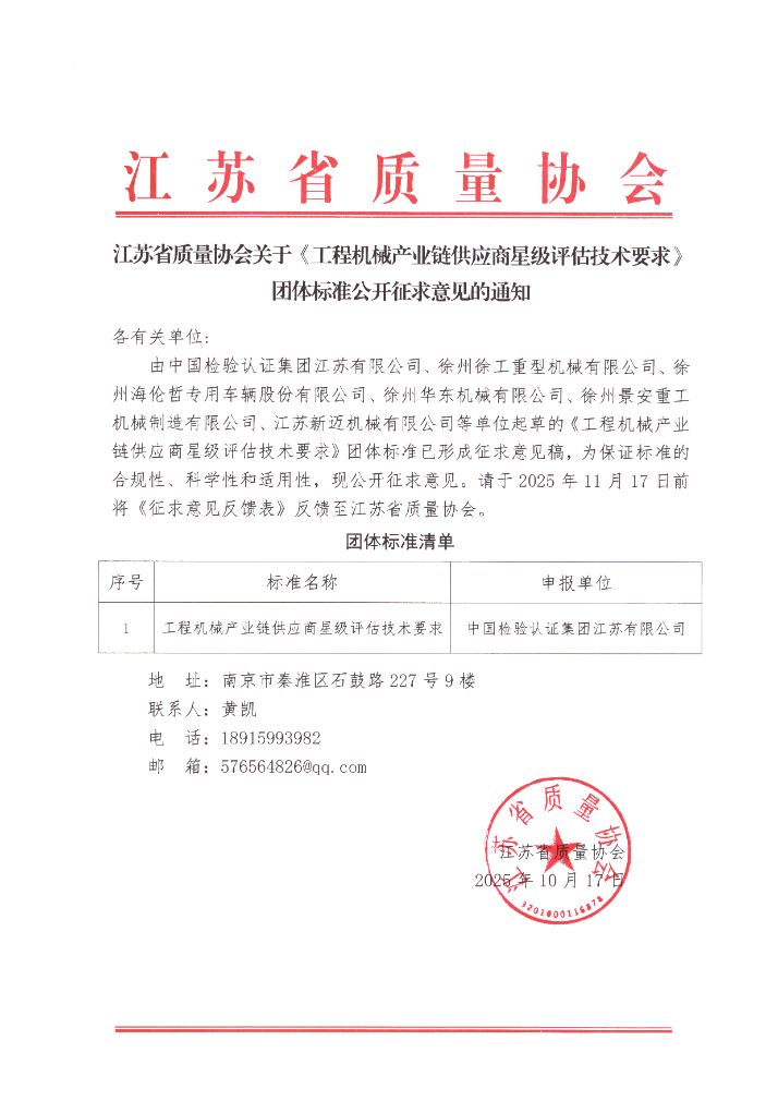江蘇省質量協會關于《工程機械產業鏈供應商星級評估技術要求》團體標準公開征求意見的通知